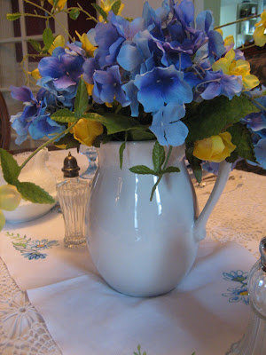 I've done a layering effect with the table linens and I've used the white stoneware pitcher with a faux flower arrangement of blue hydrangea and yellow roses as a centerpiece that was featured yesterday in my Tabletop Tuesday post (HERE).