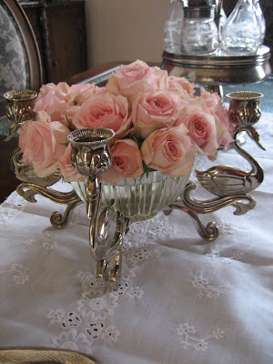 I had some extra pink spray roses from a centerpiece I made for my Queen Victoria Tea , so I put them in this. I'm not even sure what to call it, exactly. It has a glass bowl that rests on a silver-plate base with swans and small candle holders.